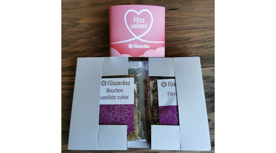 Az ajándékcsomag négy db fűszert tartalmaz díszdobozban: Provence, Bourbon vaníliás cukor, Forraltbor, Rózsabors.